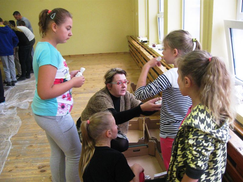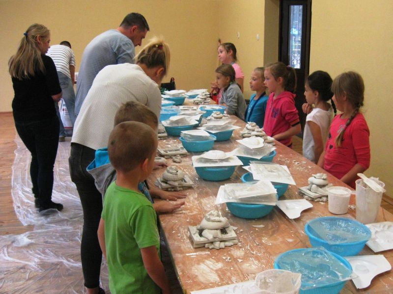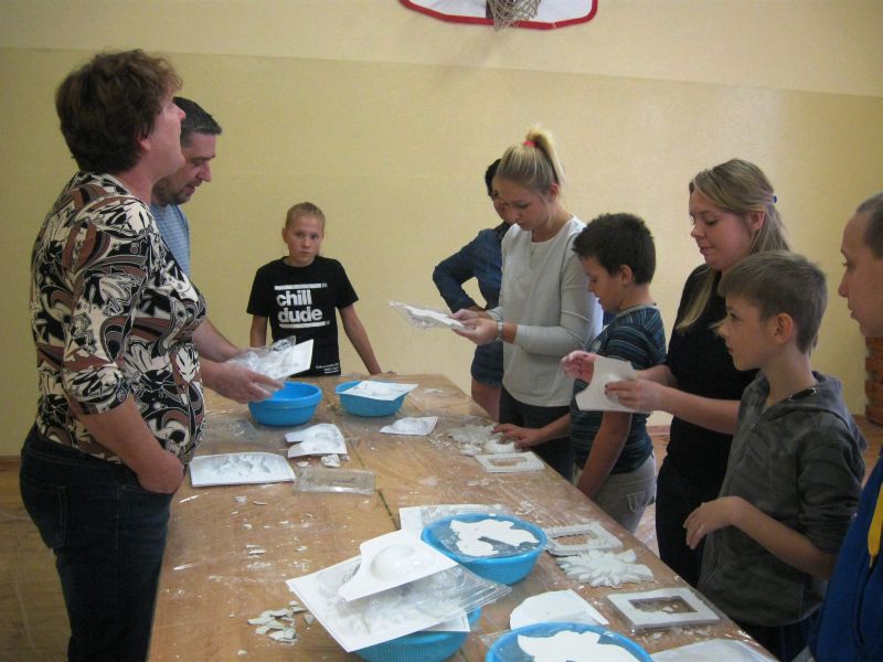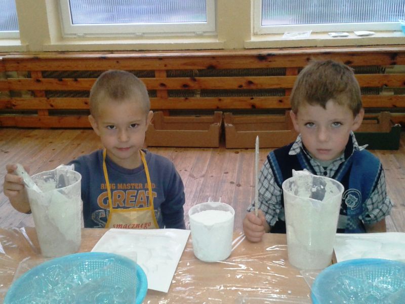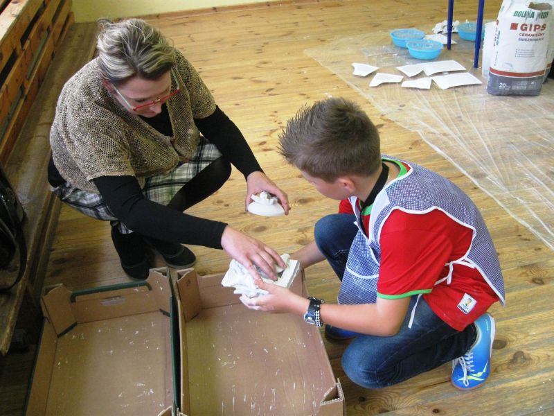 Podczas warsztatów każde dziecko otrzymało pojemnik z wodą i gipsem ceramicznym oraz formy do odlewów. Zadaniem uczniów było wykonanie różnych odlewów form gipsowych. Wszystkie dzieci skończyły warsztaty z kompletem czterech odlewów. Wytwory artystyczne muszą teraz dobrze wyschnąć, aby potem można je pomalować różnymi kolorowymi farbami.
